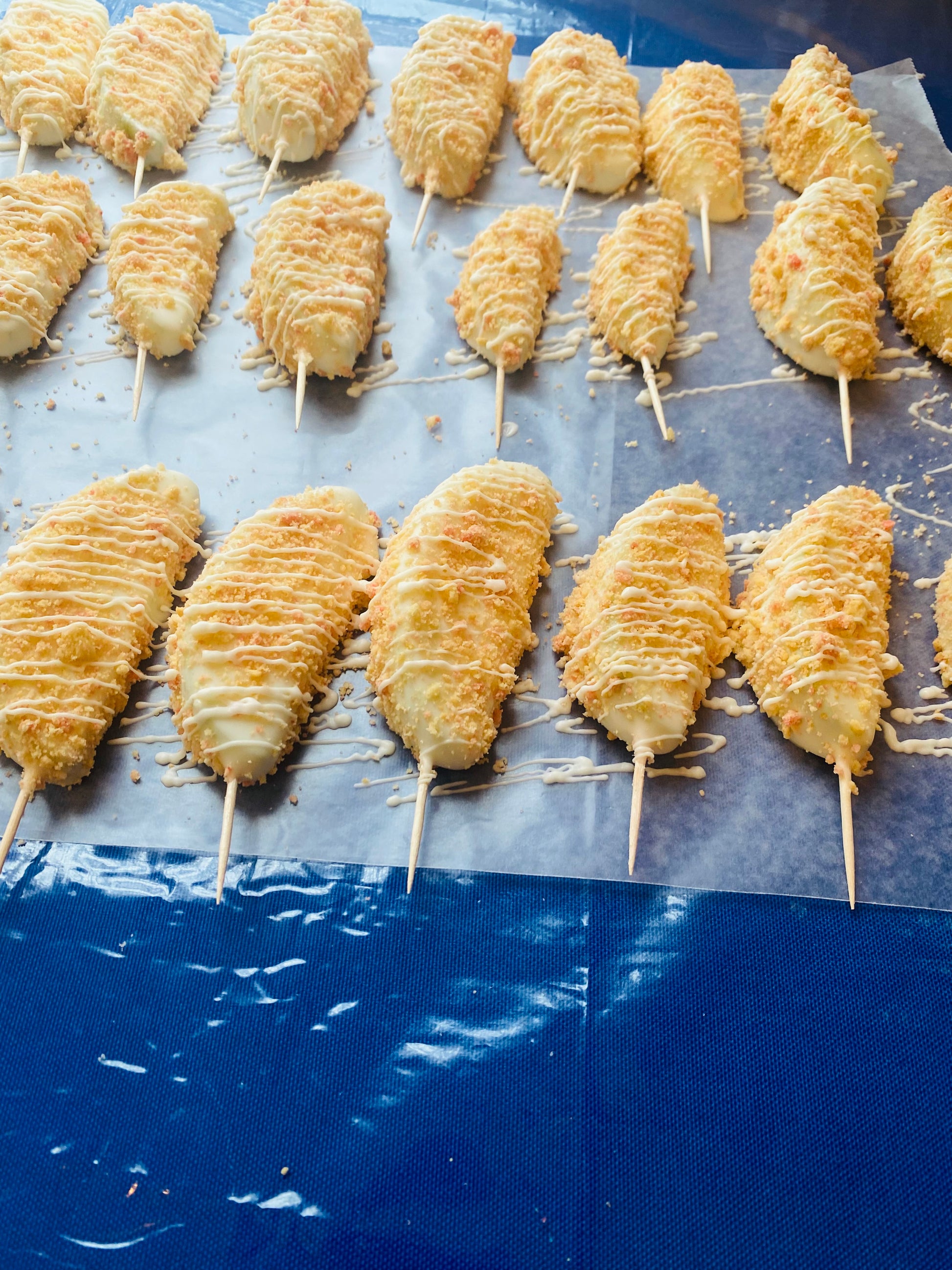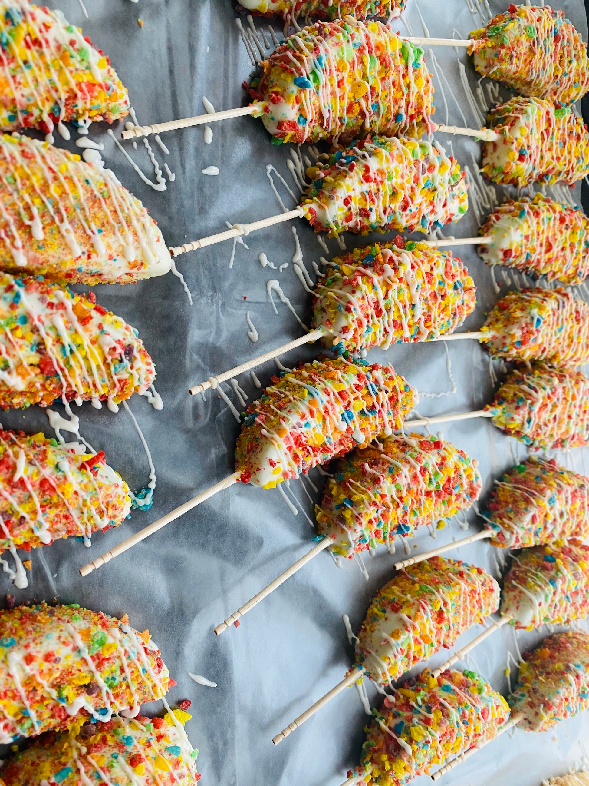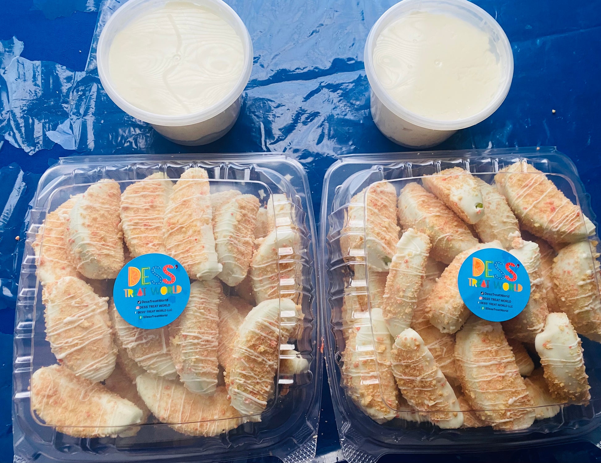 Green apple slices dipped in white chocolate covered in strawberry crunch flavored toppings. Accompanied with a large cream cheese dip.